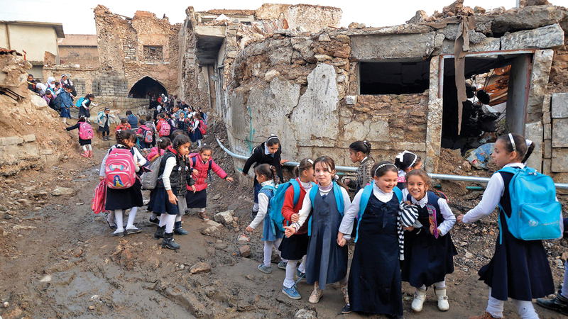 أطفال عراقيون في طريق عودتهم من مدارسهم بالموصل. أ.ف.ب