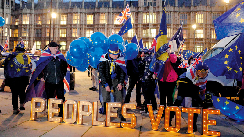 متظاهرون خارج البرلمان البريطاني يطالبون باستفتاء ثانٍ حول «بريكست». أ.ف.ب