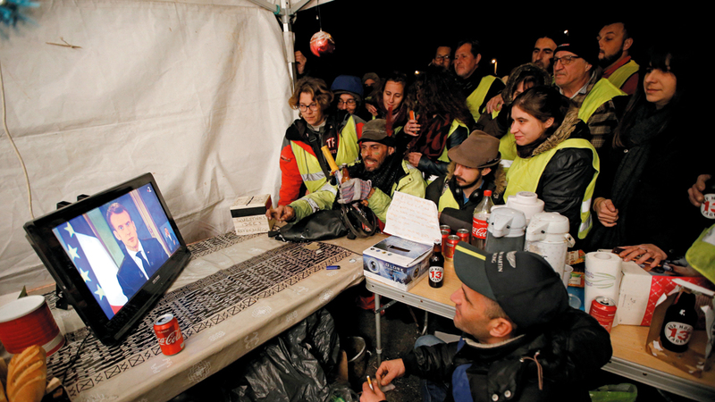 متظاهرون من حركة «السترات الصفراء» يشاهدون خطاب ماكرون. رويترز