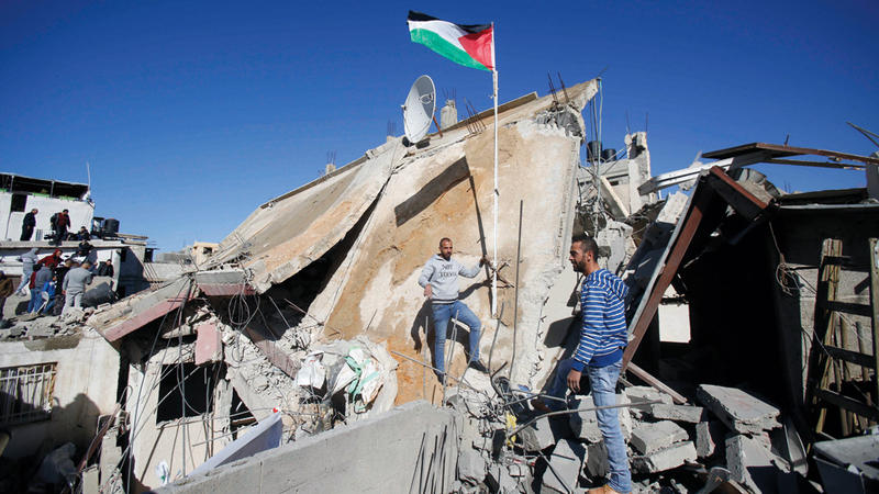 فلسطينيون أمام ركام منزل أسرة إسلام يوسف بمخيم «أماري» بعد تدميره من قبل الاحتلال. أ.ب