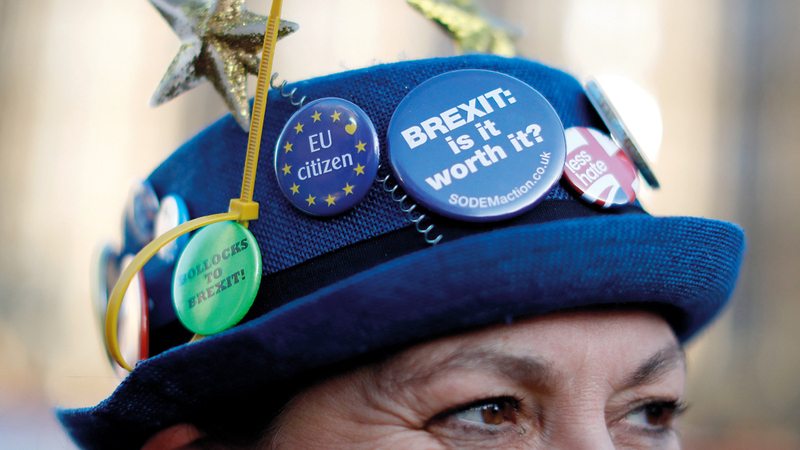امرأة ترتدي قبّعة عليها شعارات ضد «بريكست» أمام البرلمان البريطاني. أ.ف.ب