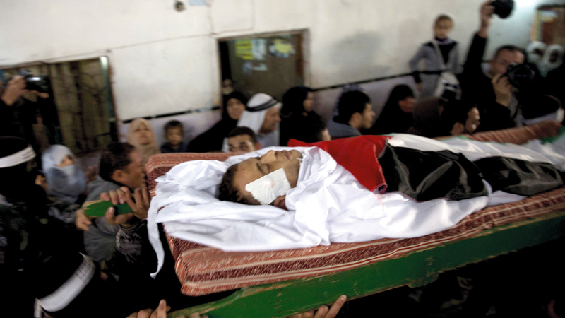 خلال تشييع الشهيد كرم فياض (26 عاماً) في خانيونس أمس. أ.ب
