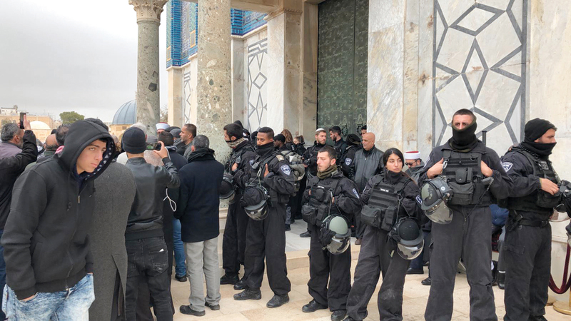 حاصرت قوة معززة من عناصر الوحدات الخاصة بشرطة الاحتلال، أمس، مسجد قبة الصخرة في القدس المحتلة، ومنعت دخول المصلين، وذلك بعد قيام حراس وسدنة المسجد بمنع أحد عناصر شرطة الاحتلال من الدخول بقبعته التلمودية (الكيبا)، واضطروا إلى إغلاق أبواب المسجد، بعد إصرار شرطة الاحتلال على اقتحامه.