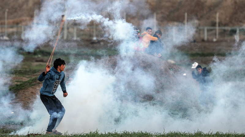 فلسطيني يقاوم غاز الاحتلال خلال المواجهات على أطراف قطاع غزة. إي.بي.إيه