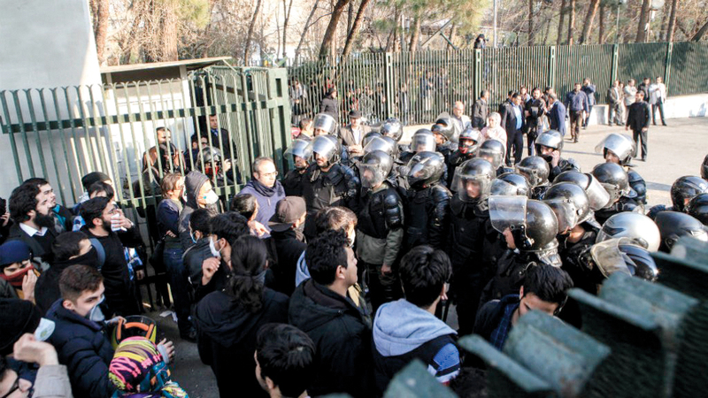 طلبة من جامعة طهران يحتجون أمام قوات الأمن. أرشيفية