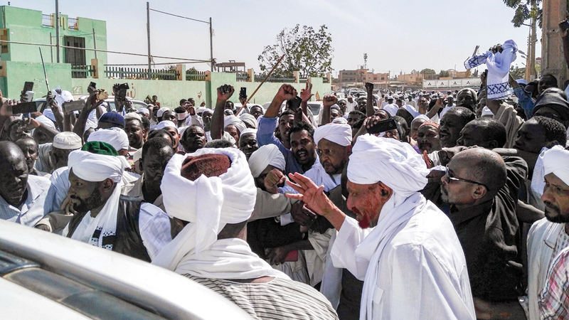 الصادق المهدي محاطاً بالحشود بعد خروجه من مسجد الأنصار بمدينة أم درمان. أ.ف.ب
