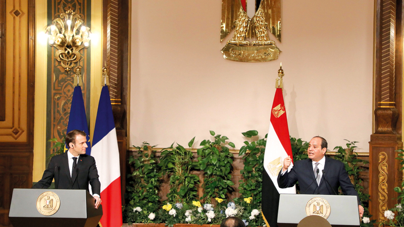 السيسي وماكرون خلال المؤتمر الصحافي أمس. أ.ف.ب