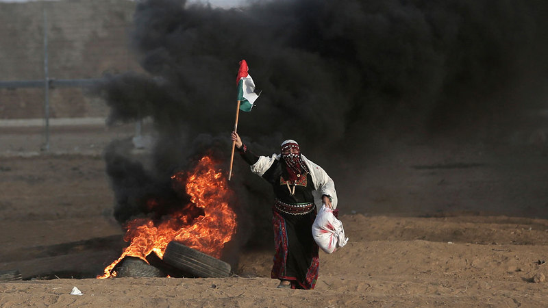 فلسطينية ترفع العلم خلال مواجهات مسيرات العودة في غزة. أ.ب