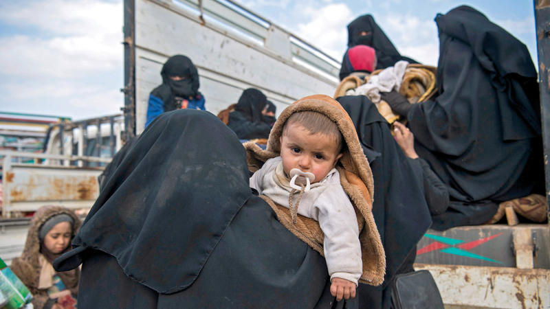 بعض النساء يحاولن الفرار مع أطفالهن من معركة الباغوز. أ.ف.ب