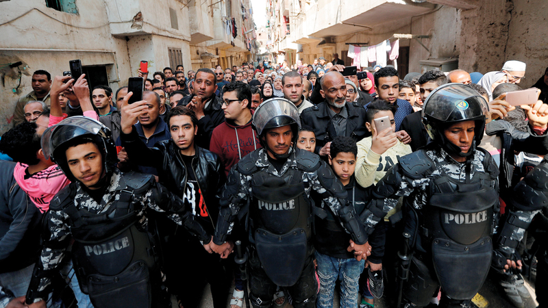 عناصر شرطة ومصريون خلال تشييع ضحايا تفجير القاهرة الإرهابي. رويترز