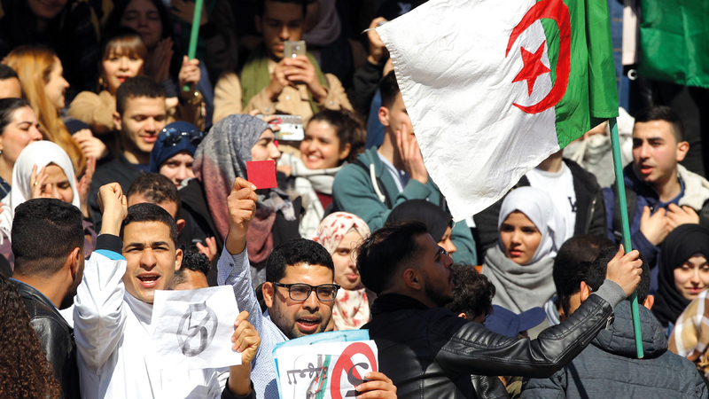 الطلاب يتجمعون داخل حرم جامعي في الجزائر ضد ولاية خامسة لبوتفليقة. أ.ب