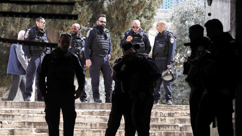 قوات الاحتلال تقف عند أحد أبواب المسجد الأقصى أمس. أي.بي.أيه
