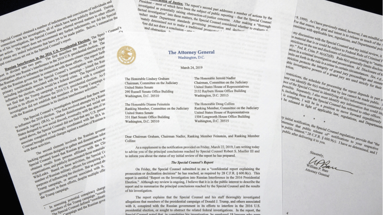 وجاءت النتائج الرئيسية للتقرير، الذي استغرق العمل فيه نحو العامين ونصف العام، في رسالة إلى الكونغرس أعدها المدعي العام ويليام بار، حسبما أعلن رئيس اللجنة القضائية بمجلس النواب غيري نادلر.