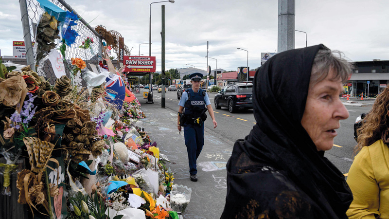 باقات زهور قرب أحد المسجدين في كرايستشيرش. أ.ف.ب