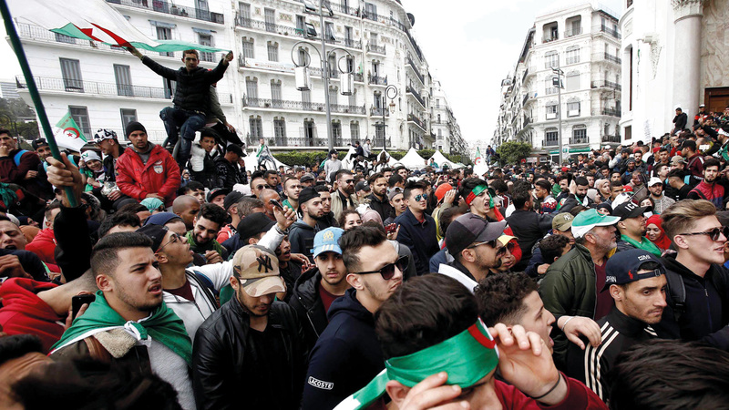 وتجمع المتظاهرون في وسط الجزائر العاصمة، أمس، للمطالبة باستقالة الرئيس عبدالعزيز بوتفليقة، ليتواصل بذلك الضغط بعد احتجاجات مستمرة منذ أسابيع وتهدد بالإطاحة ببوتفليقة والنخبة الحاكمة.