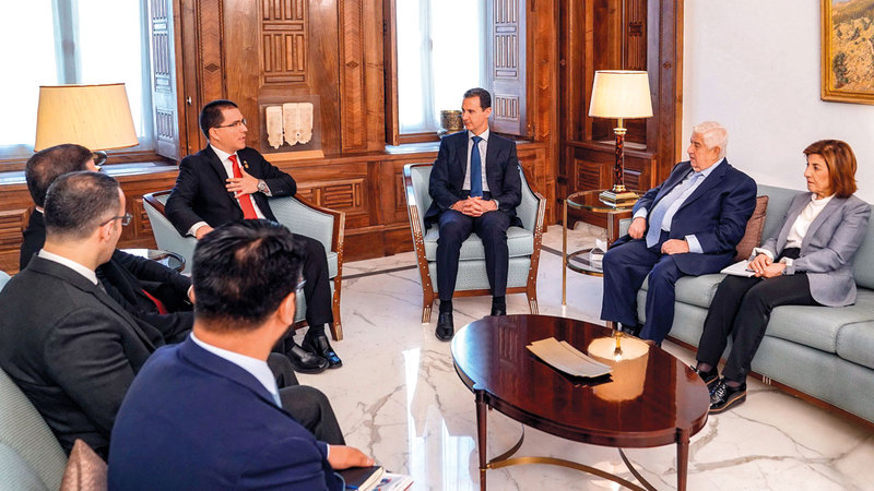 الرئيس السوري بشار الأسد ووزير خارجيته وليد المعلم خلال لقائهما وزير الخارجية الفنزويلي خورخي أريازا. أ.ف.ب