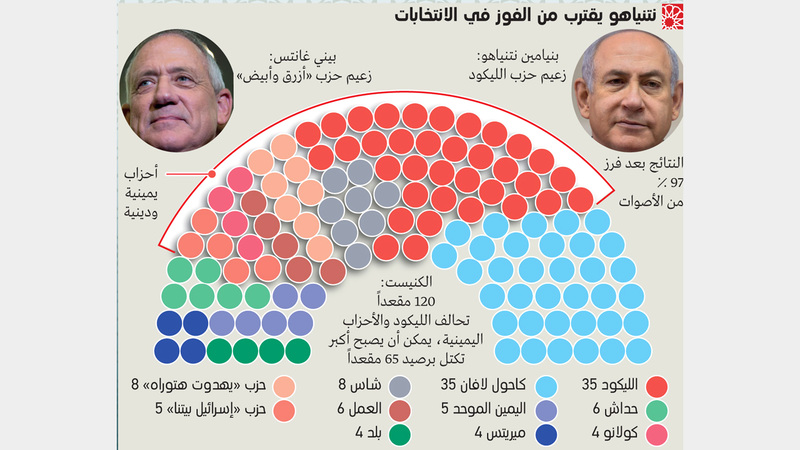 يتّجه رئيس الوزراء الإسرائيلي، بنيامين نتنياهو، للفوز بولاية خامسة، بعدما أظهرت النتائج شبه النهائية للانتخابات التشريعية التي جرت، أول من أمس، في إسرائيل أنه في أفضل موقع ليكلف بتشكيل الحكومة الجديدة، فيما أكد مسؤولون فلسطينيون أنهم ينتظرون الأسوأ لقضيتهم بعد فوز معسكر اليمين الحاكم. وتفيد الأرقام التي نشرتها وسائل الإعلام، بعد فرز 97% من الأصوات، أن حزب نتنياهو سيشغل عدداً من المقاعد، وهو 35، يساوي عدد المقاعد التي حصل عليها حزب «أزرق أبيض» (يمين الوسط) الذي يقوده بيني غانتس. لكنها تتوقع أن يتمكن نتنياهو من جذب أحزاب اليمين، والحصول على دعم 65 نائباً من أصل 120 في الكنيست.