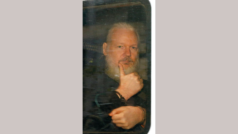 أسانغ بعد توقيفه في لندن أمس. رويترز