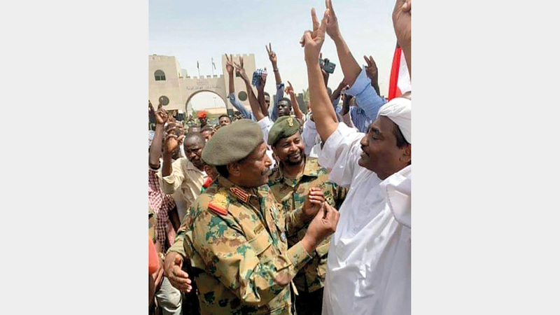 الفريق البرهان مع المعتصمين أمام قيادة الجيش بالخرطوم. أ.ف.ب