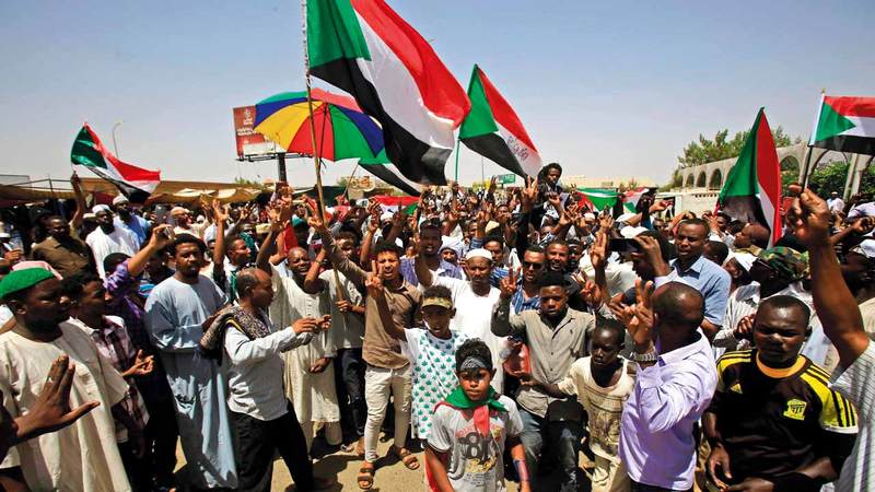 ويشير مسؤولون إلى أن 65 شخصاً قتلوا في أعمال عنف متصلة بالتظاهرات منذ ديسمبر الماضي. ولايزال مئات المتظاهرين يهتفون بالشعار الذي رددوه خلال الاحتجاجات التي أطاحت البشير «حرية، سلام، عدالة»، رافعين إشارات النصر، في وقت تتجاوز درجات الحرارة في منتصف النهار 40 درجة مئوية.