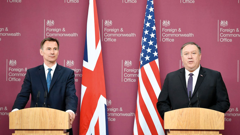 بومبيو وهنت خلال مؤتمر صحافي في لندن. أ.ف.ب