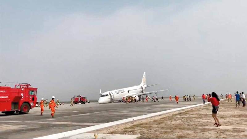 هبطت طائرة تابعة لخطوط ميانمار الجوية الوطنية اضطرارياً في مطار ماندالاي الدولي، أمس، باستخدام عجلاتها الخلفية فقط، بعد تعطل جهاز الهبوط الأمامي.