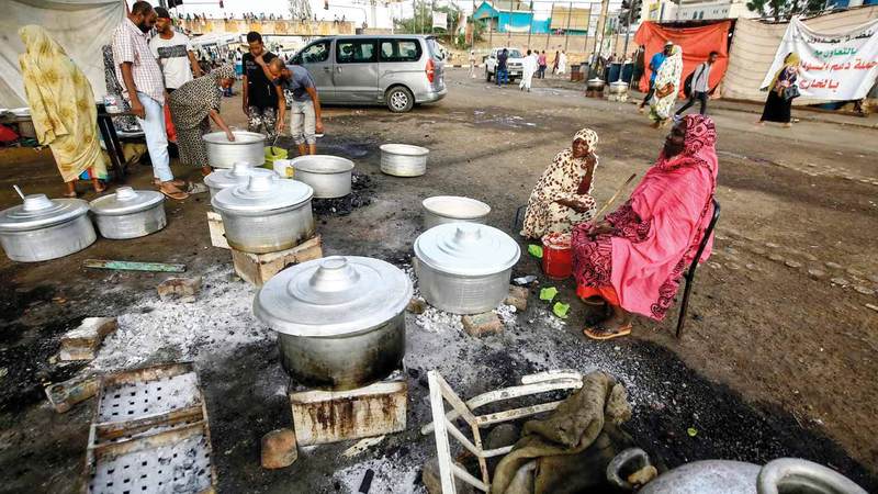 سودانيون يعدّون طعام الإفطار للمعتصمين أمام مقر قيادة الجيش. أ.ف.ب