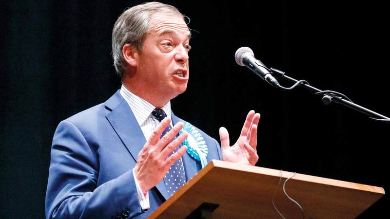 زعيم حزب «بريكست» نايجل فاراج يخطب في مؤيديه عقب الفوز. أ.ف.ب