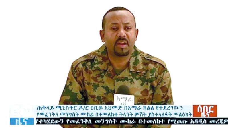 رئيس وزراء إثيوبيا أبي أحمد في خطاب متلفز مرتدياً البزة العسكرية. أ.ف.ب