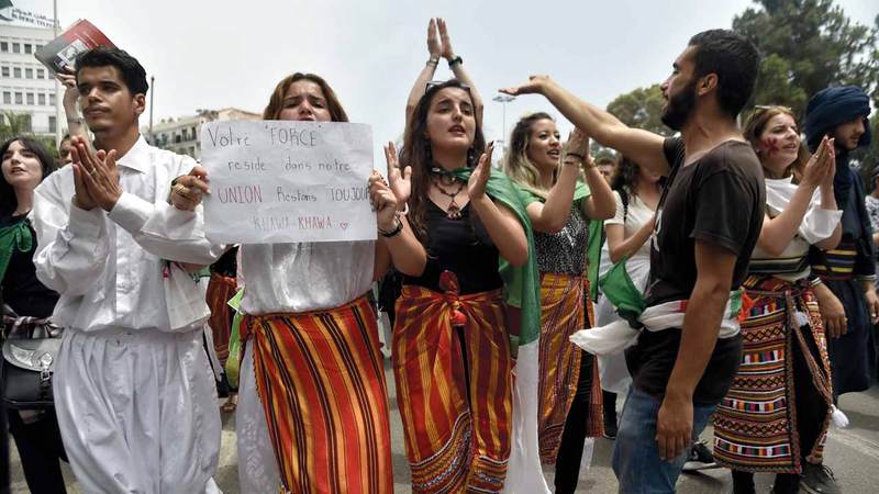 متظاهرون يرتدون الزي الأمازيغي خلال احتجاج بالجزائر. أ.ف.ب