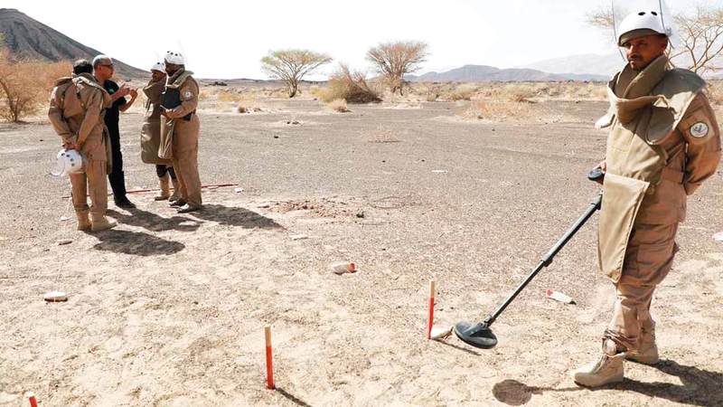 فريق «مسام» خلال عمله في أحد مواقع نزع الألغام باليمن. أرشيفية