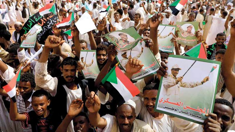 مؤيدون للمجلس العسكري خلال فاعلية حضرها نائب رئيس المجلس محمد حمدان «حميدتي» قرب الخرطوم. رويترز