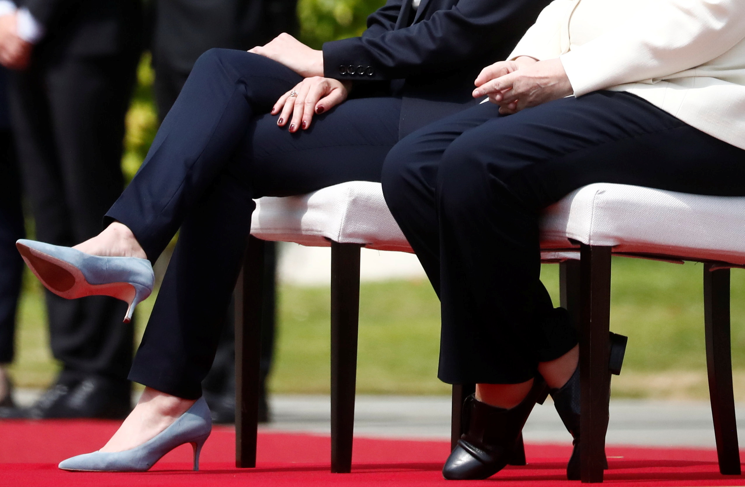 وجلست ميركل، التي ستحتفل الاربعاء القادم بعيد ميلادها الخامس والستين، على كرسي أبيض بجانب رئيسة الحكومة الدنماركية ماتي فريدريكسن التي جلست هي الاخرى على كرسي أثناء مراسم تحية العلمين في ساحة الحكومة الالمانية.