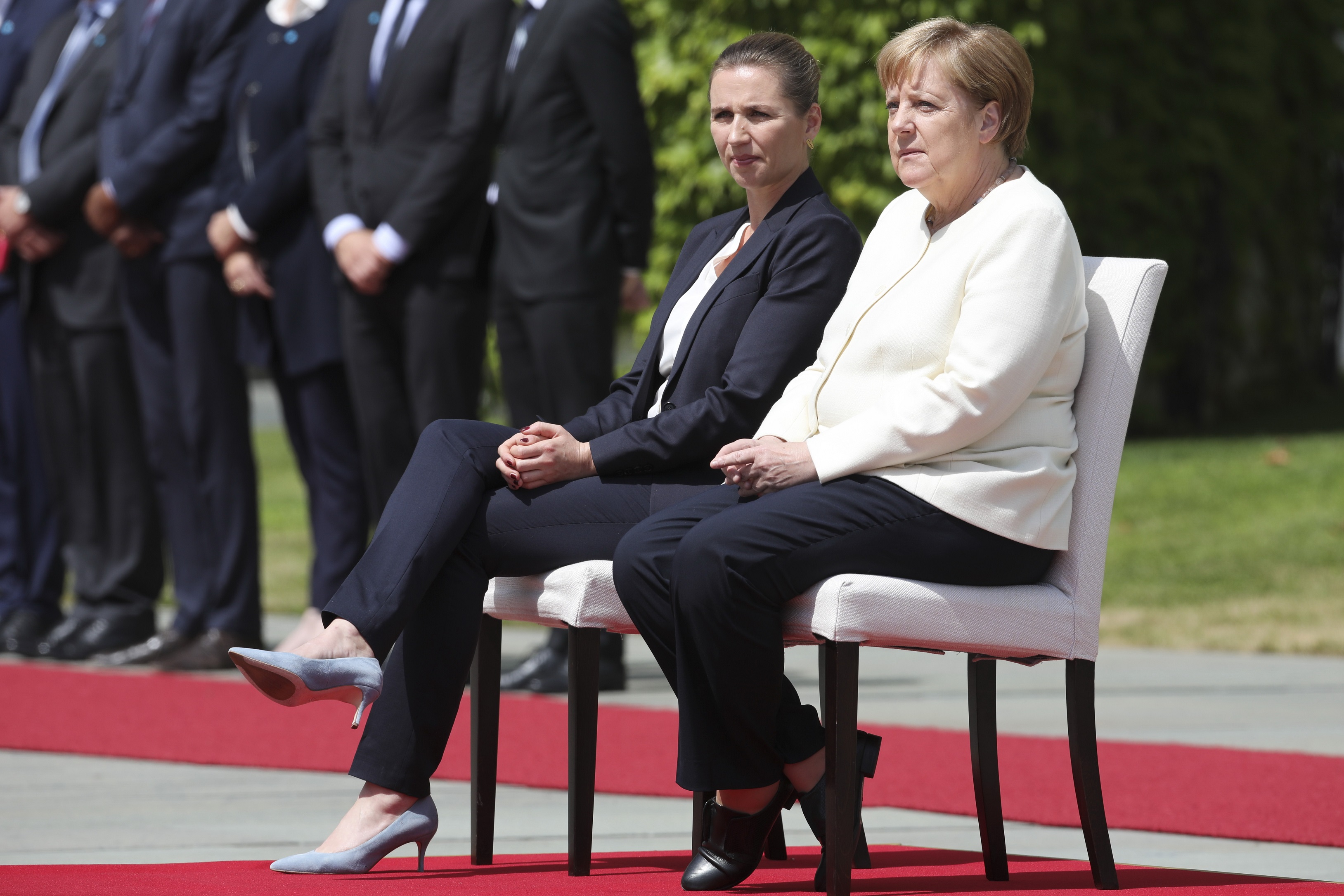 جلست المستشارة الالمانية انغيلا ميركل بشكل استثنائي، على كرسي الخميس اثناء مراسم تحية العلمين الوطنيين مع نظيرتها الدنماركية وذلك غداة نوبة ارتجاف جديدة اثارت اسئلة عن وضعها الصحي.