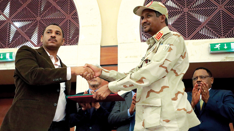 وقال نائب رئيس المجلس العسكري الحاكم محمد حمدان دقلو المعروف أيضاً باسم «حميدتي»، والذي وقع الوثيقة بالنيابة عن المجلس العسكري، «هذه لحظة تاريخية» للسودان.