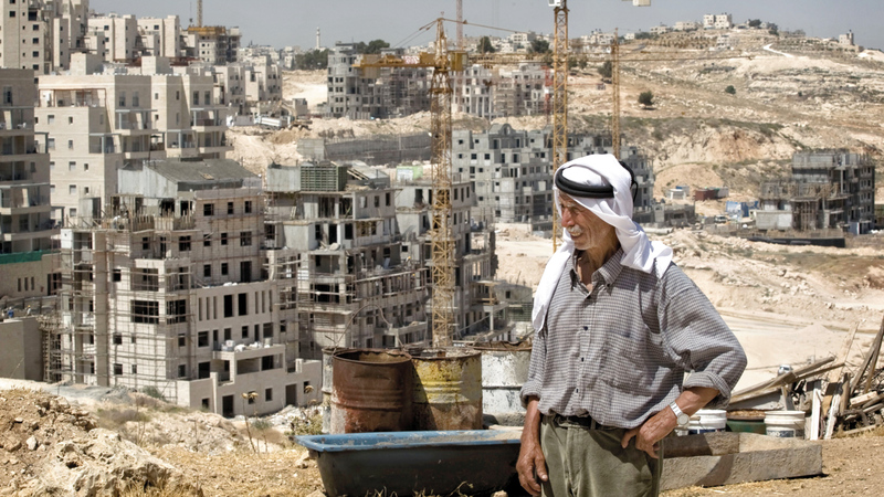 فلسطيني يقف بجوار منزله وخلفه عمليات توسيع للاستيطان في القدس الشرقية. أ.ب