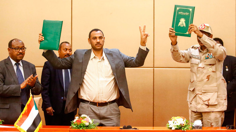 وقّع المجلس العسكري الحاكم في السودان، وقادة الاحتجاج، أمس، بالأحرف الأولى، الإعلان الدستوري الذي من شأنه أن يمهّد الطريق لتسليم السلطة إلى هيئة انتقالية جديدة، معظمها من المدنيين، كما تم الاتفاق على تواريخ زمنية للتوقيع الرسمي على الإعلان الدستوري، واختيار رئيس الوزراء وأعضاء الحكومة، تبدأ من 17 أغسطس الجاري، فيما أكد وزير الدولة للشؤون الخارجية، الدكتور أنور قرقاش، أن السودان دخل حقبة جديدة في تاريخه السياسي، بالتحول إلى الحكم المدني.