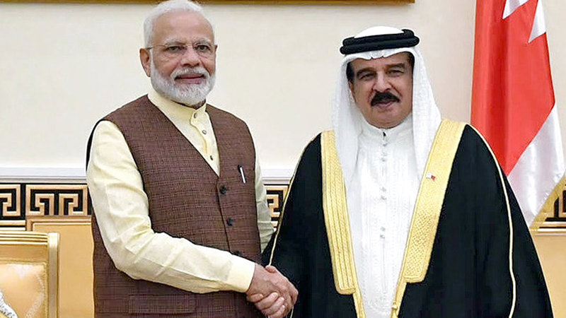بحث ملك مملكة البحرين حمد بن عيسى آل خليفة، ورئيس الوزراء الهندي ناريندرا مودي، أول من أمس، في قصر القضيبية - مجريات الأحداث على الصعيدين الإقليمي والدولي والقضايا موضع الاهتمام المشترك.