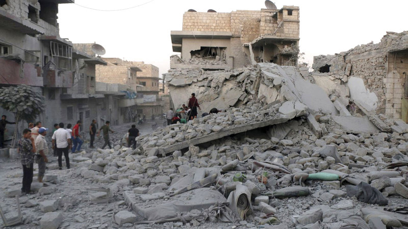عناصر الدفاع المدني خلال البحث عن ناجين تحت أنقاض قصف على معرة النعمان. أ.ب