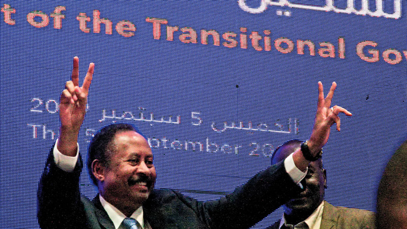 حمدوك يرفع شارة النصر عقب إعلان تشكيلة حكومته. أ.ف.ب