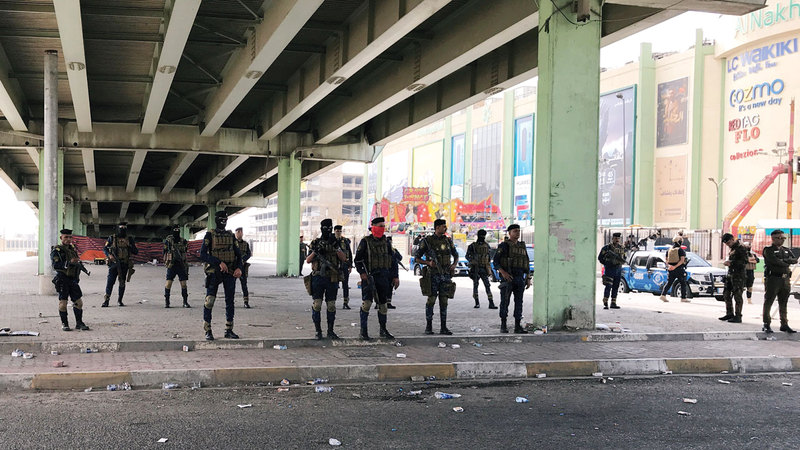 وجابت قوات الطرق الرئيسة والأماكن العامة في بغداد، لكن بحلول النهار كانت تظاهرات صغيرة ومتفرقة قد بدأت تتجمع مرة أخرى في تحدٍّ للحظر المفتوح، الذي فُرض في العاصمة من الساعة الخامسة صباحاً.