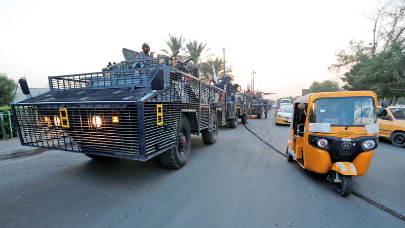 مدرعات للشرطة العراقية تسير بين المركبات العامة لحفظ الأمن في بغداد. رويترز