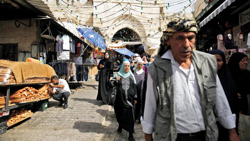 مقدسيون يسيرون عند بوابة دمشق في البلدة القديمة بالقدس. رويترز