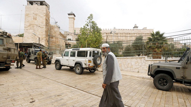 فلسطيني يمر أمام قوات الاحتلال بمحيط الحرم الإبراهيمي. أرشيفية