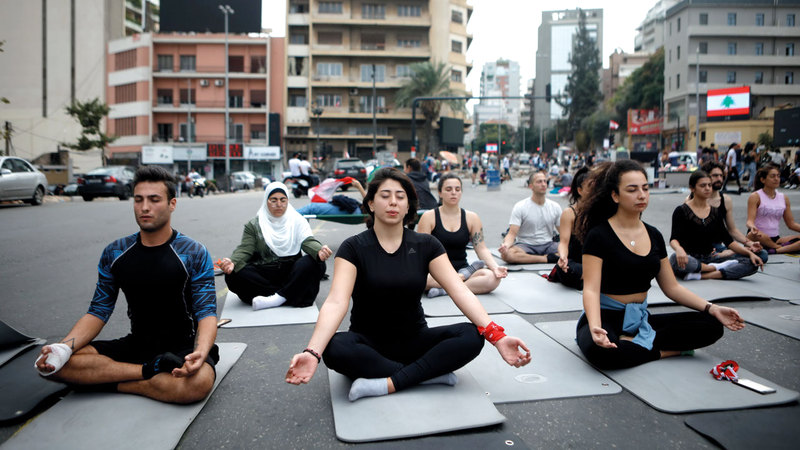 المتظاهرون المناهضون للحكومة يمارسون اليوغا في شارع مغلق في وسط بيروت. أ.ف.ب