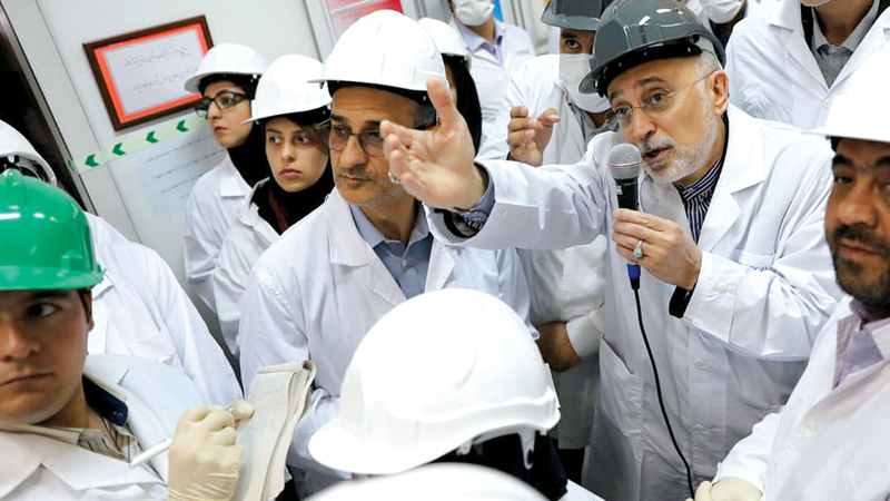 مسؤولون إيرانيون بمحطة طاقة نووية في أصفهان أول من أمس. إي.بي.إيه