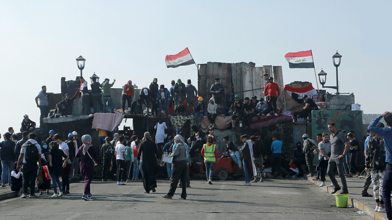 متظاهرو العراق يتحدّون قوات الأمن ويتجمّعون أعلى الحواجز التي أقامتها على جسر الأحرار في بغداد. أ.ب