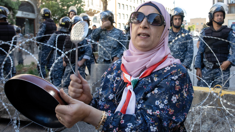 متظاهرة تطرق على أواني الطعام قرب البرلمان اللبناني أمس. إي.بي.إيه