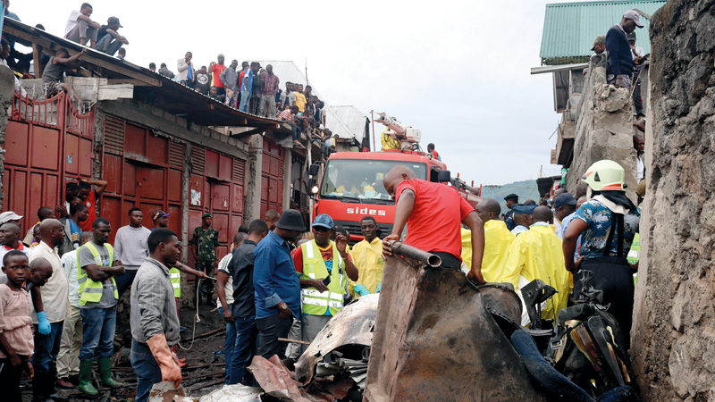 أعلنت فرق الإنقاذ العثور على 27 جثة، أمس، بعد ساعات من تحطم طائرة صغيرة في منطقة ذات كثافة سكانية عالية بمدينة غوما في جمهورية الكونغو الديمقراطية، وأظهرت صور بثتها وكالات الأنباء حطام الطائرة ينتشر أعلى مباني المنطقة التي سقطت فيها الطائرة، وتسبب الحادث في حالة من الذعر والهلع بين السكان.