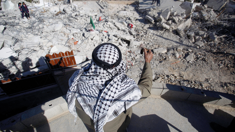 جرافات الاحتلال هدمت 4 منازل في بلدة بيت كاحل بالخليل لأسرى فلسطينيين. أ.ب